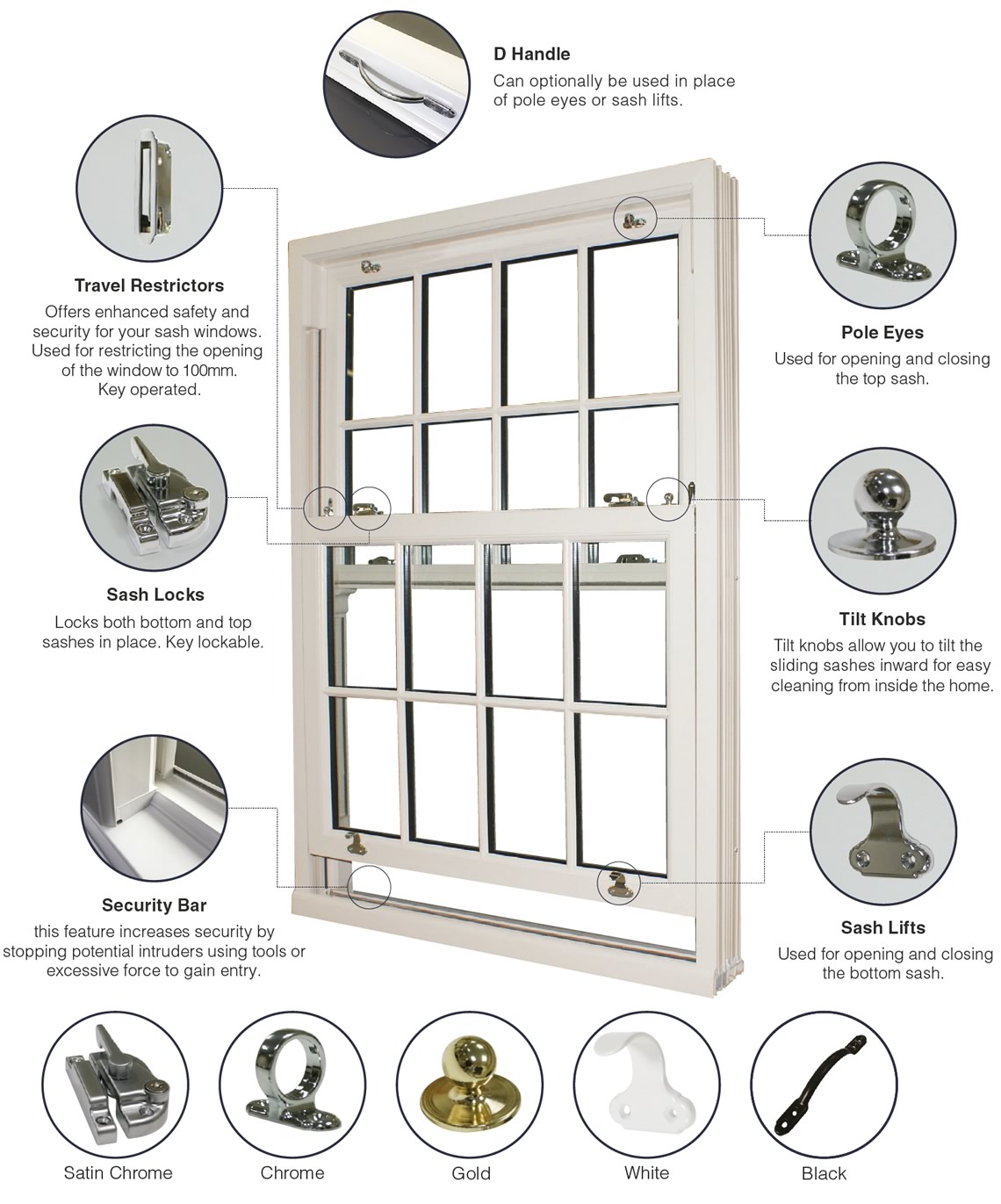 PVC-U sash windows feature traditionally-styled vertical slider hardware. Pole eyes, tilt knobs, sash lifts, sash locks and travel restrictors are fitted as standard, but we can also offer D handles if needed. All hardware is available in Chrome, Gold, White, Black or Satin Chrome to complement our range of sash window frame colours.
